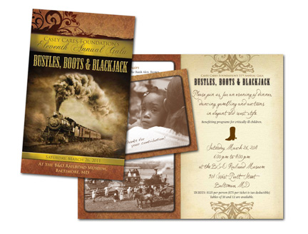 The Casey Cares Foundation is dedicated to enhancing the lives of critically ill children and DPI is proud to help out in any way we can. DPI designs various materials for Casey Cares throughout the year, like this invitation to their western themed gala, held at the B & O Railroad Museum. Please take a moment to visit their site and help the kids.